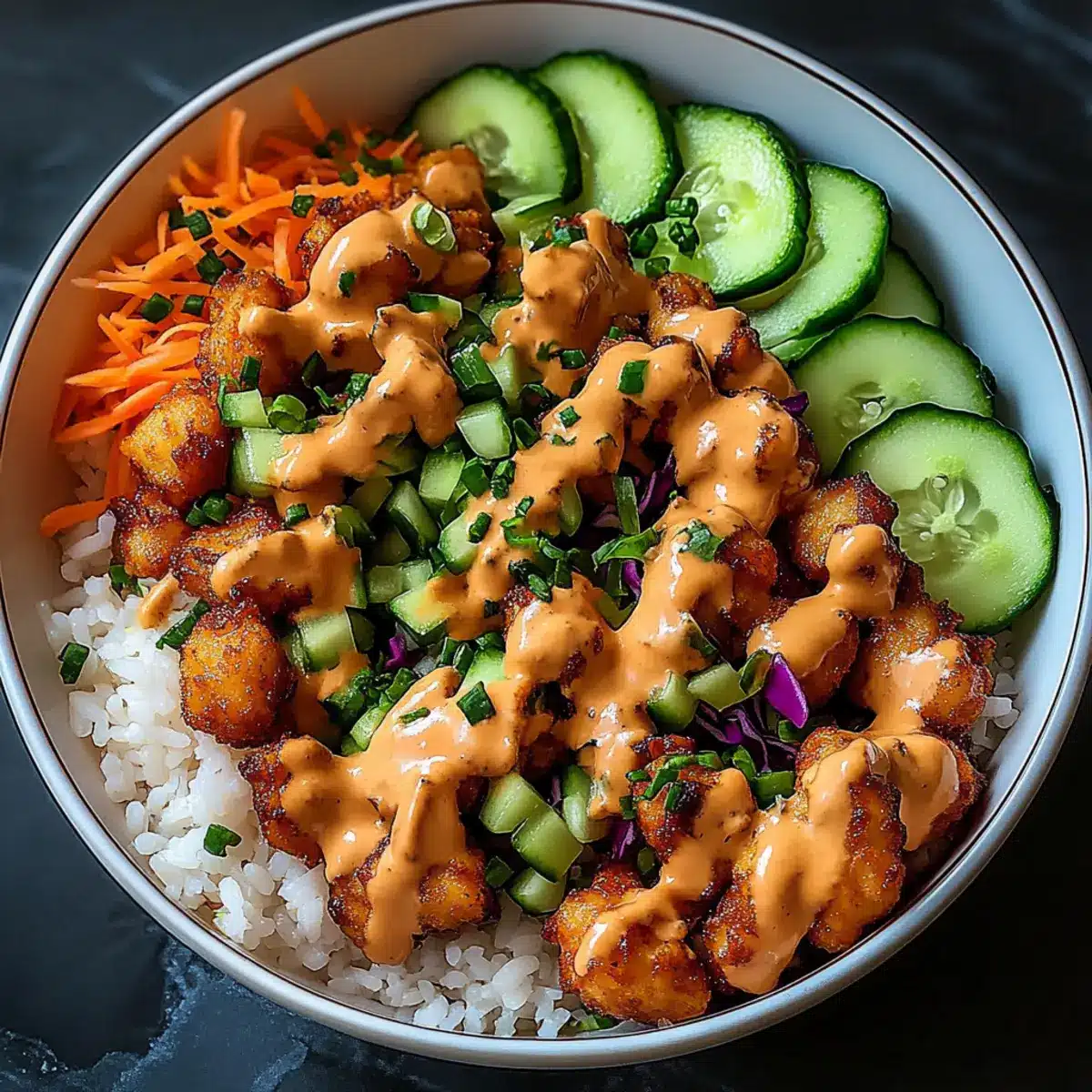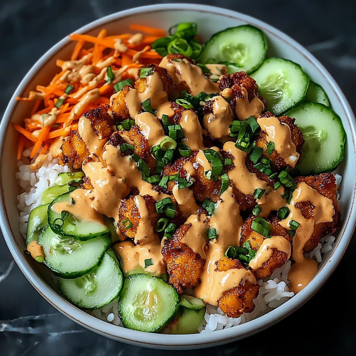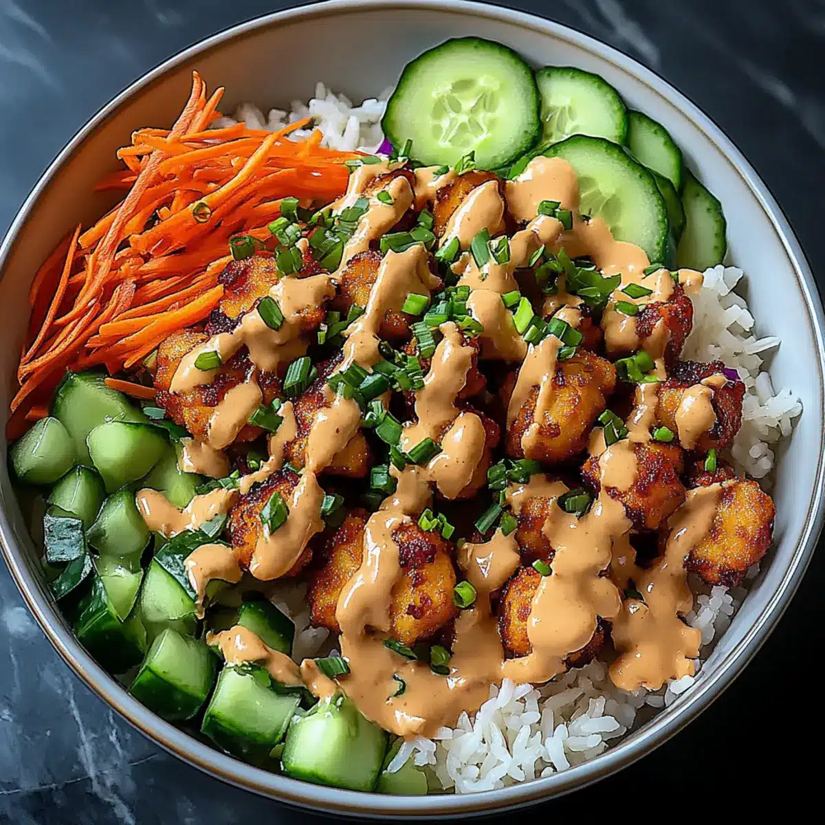 Once the chicken is cooked, it’s time to assemble your Bang Bang Chicken Bowl. Start with a base of 2 cups of cooked rice, whether white or brown. Layer on the crispy chicken, followed by 1 cup of shredded carrots, 1 cup of thinly sliced cucumber, 1 cup of shredded red cabbage, and 2 sliced green onions, creating a colorful display that’s as appealing as it is tasty.