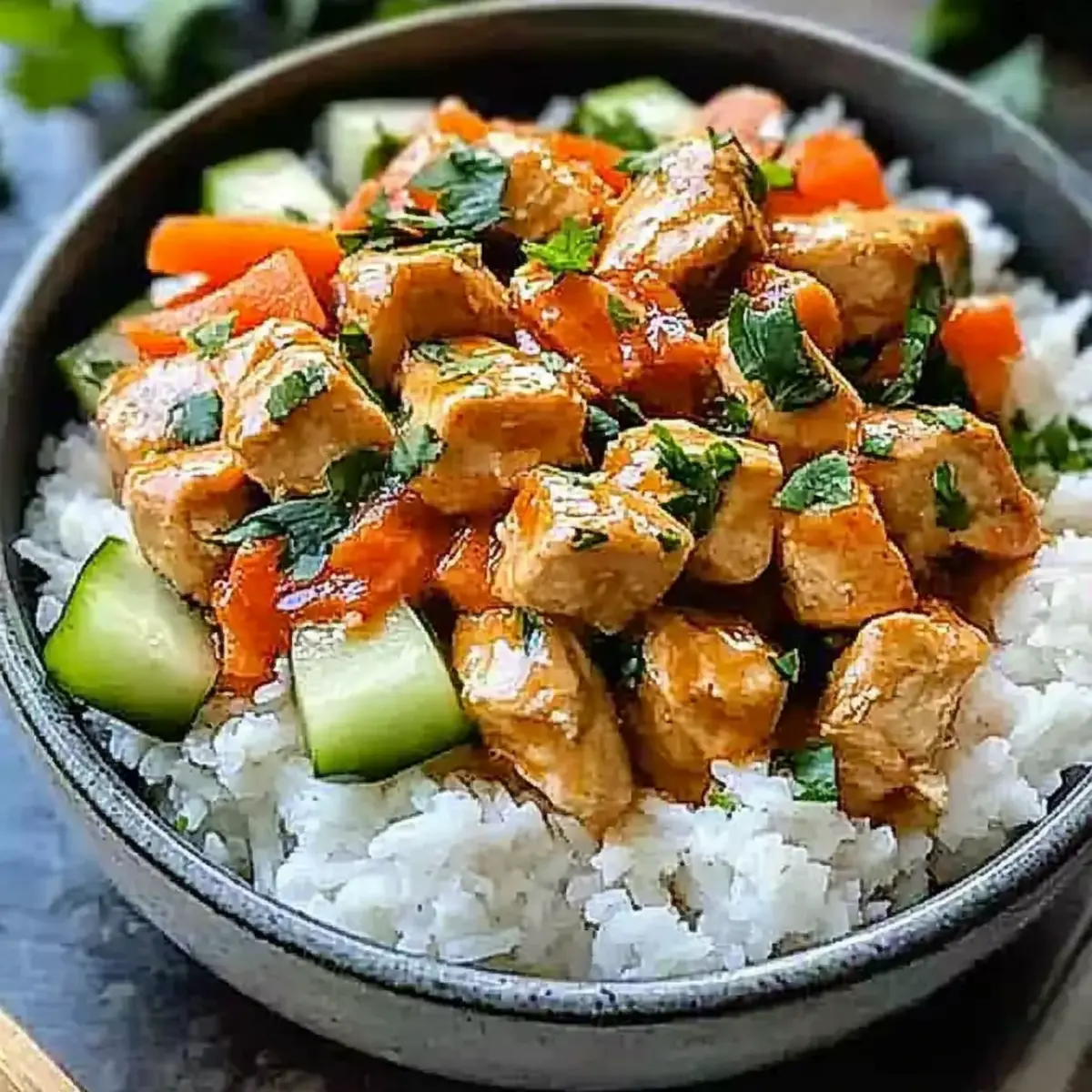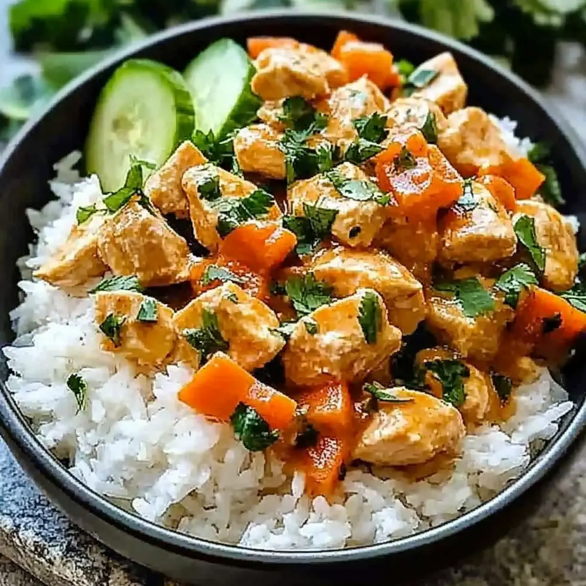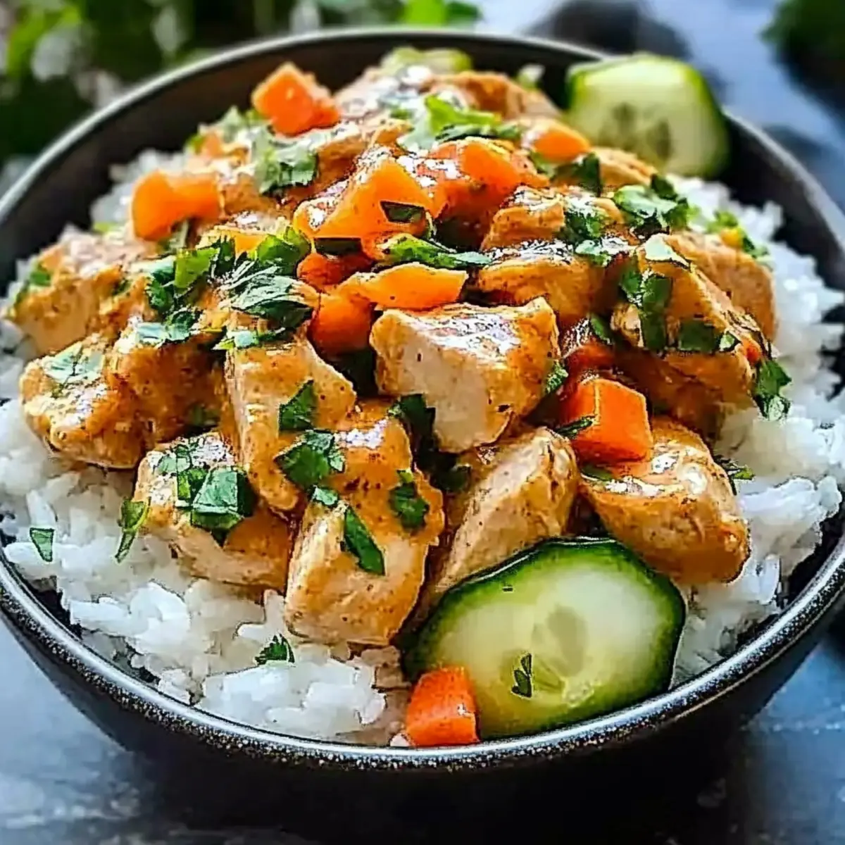 To create your Coconut Chicken Rice Bowl, start with a generous scoop of the fluffy coconut rice at the bottom of a bowl. Layer the sliced chicken on top, then drizzle with the creamy sauce. Add fresh shredded carrots, cucumber slices, and a sprinkle of cilantro for color and crunch.