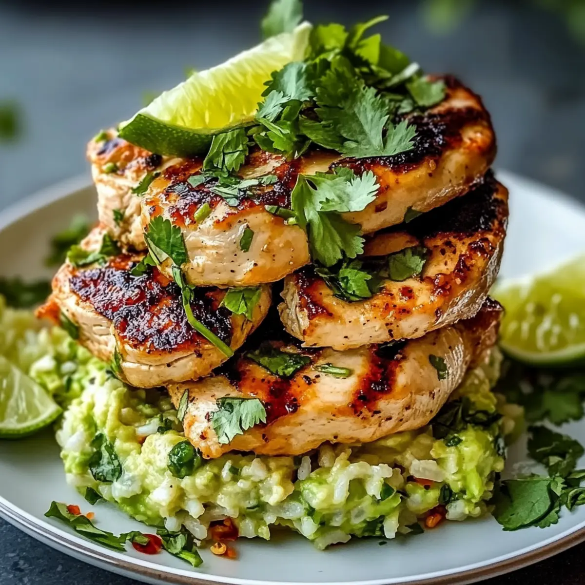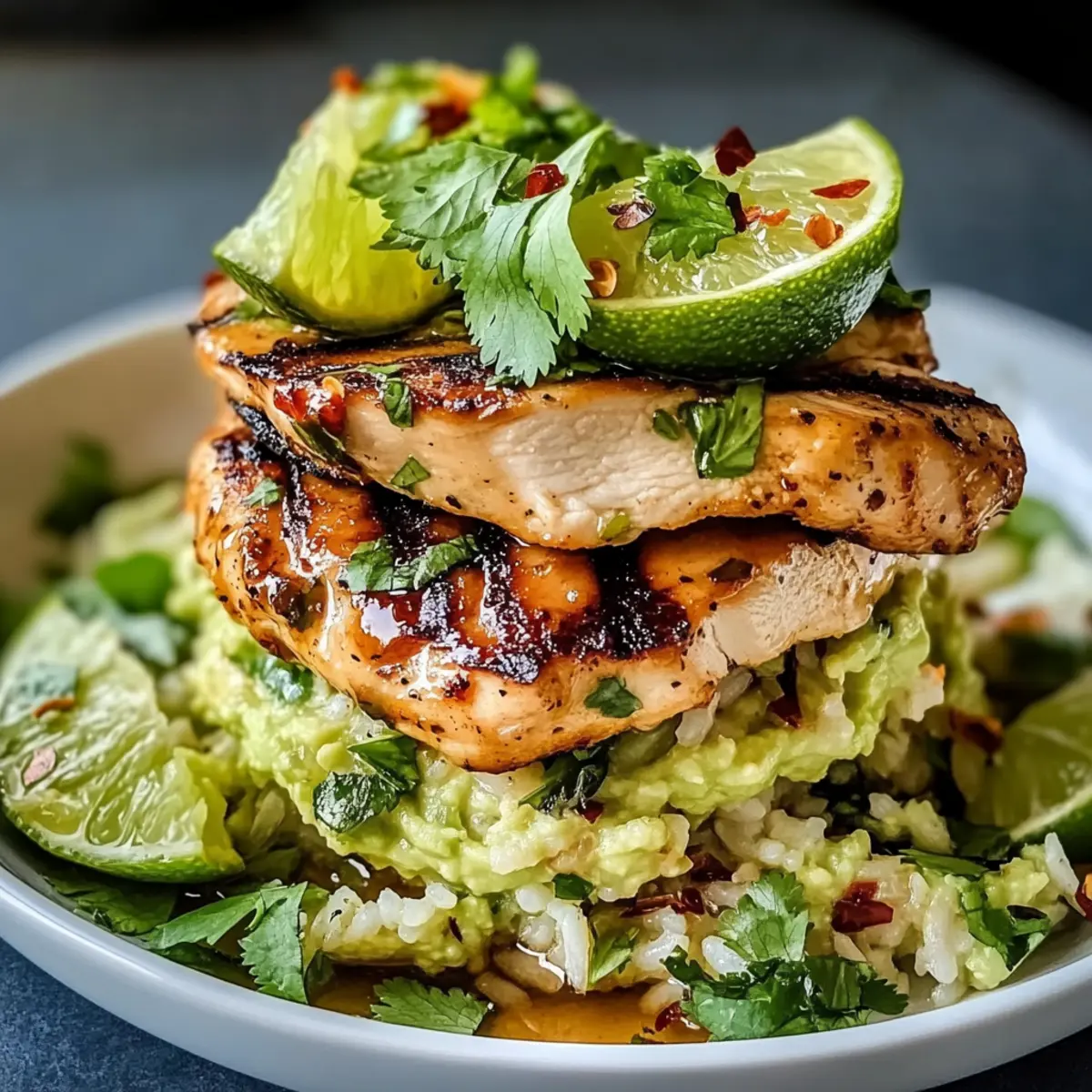 - Layer the creamy avocado rice in a ring mold or on a plate, slice the grilled chicken, arrange it atop the rice, garnish with cilantro, lime zest, chili flakes, and sesame seeds. Drizzle with extra lime juice if desired.
