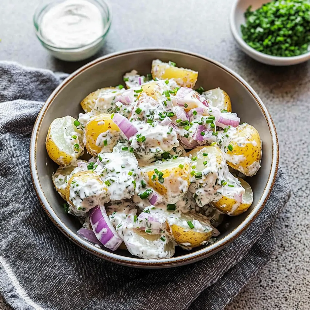 The aroma of simmering potatoes brings back memories of summer gatherings filled with laughter and good food. This Creamy No-Mayo Sour Cream and Onion Potato Salad is my go-to side dish when I want to impress at barbecues or family picnics. With a creamy, tangy base that avoids the heaviness of mayonnaise, it’s a delightful twist on a classic comfort food that everyone can enjoy. Not only is this potato salad a healthier alternative, but it’s also a breeze to whip up, making it a perfect last-minute addition to any meal. Plus, the combination of tender baby gold potatoes and the satisfying crunch of fresh onions creates a texture that’s simply irresistible. Are you ready to dive into a refreshing recipe that brings joy and flavor to your table?