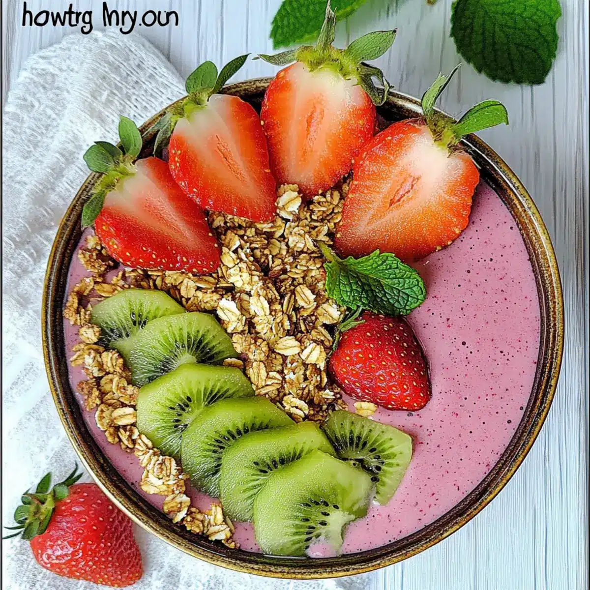 - Top your Strawberry Kiwi Smoothie Bowl with granola, kiwi slices, strawberry slices, coconut flakes, and fresh mint.